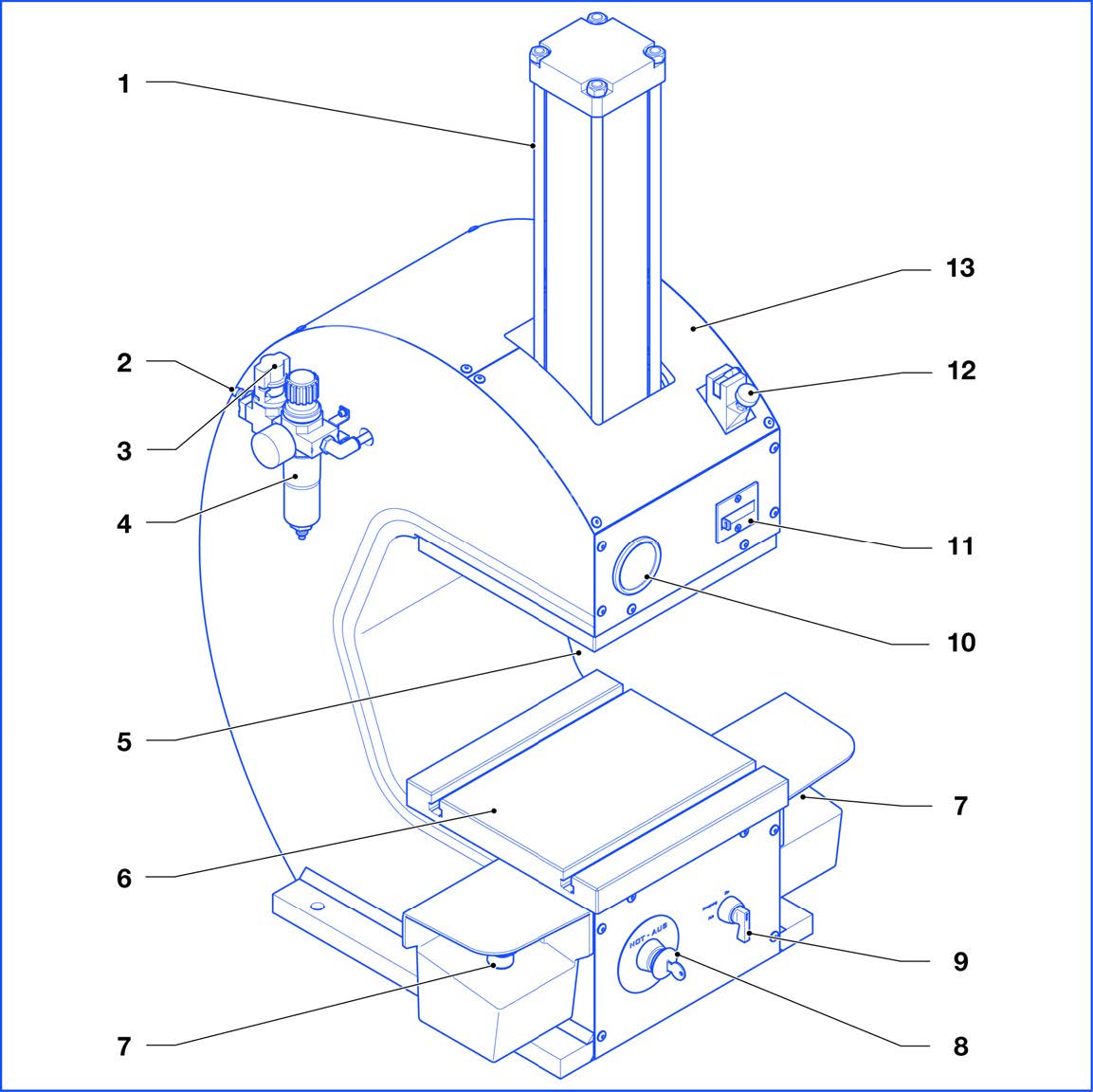Weitere Ausstattungsmerkmale sind die Verdrehsicherung des Kolbens (kein Verdrehen des Prägewerkzeuges), die Drossel zur Einstellung des Prägedruckes, der Stückzähler und der Not-Aus-Taster.